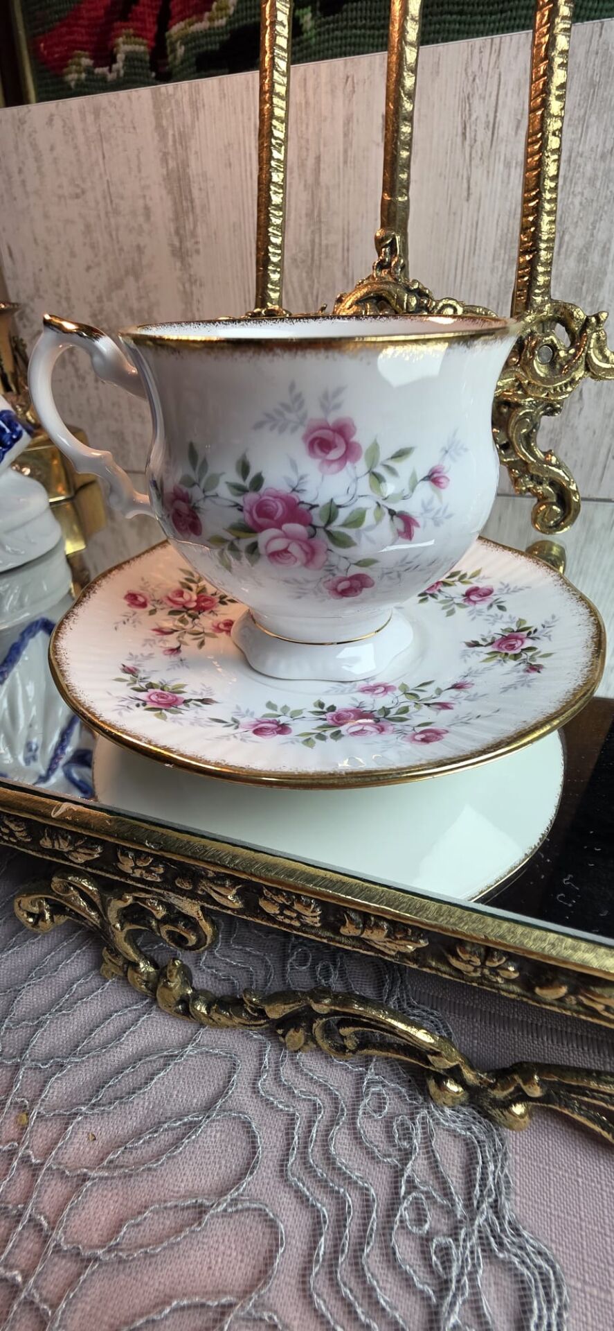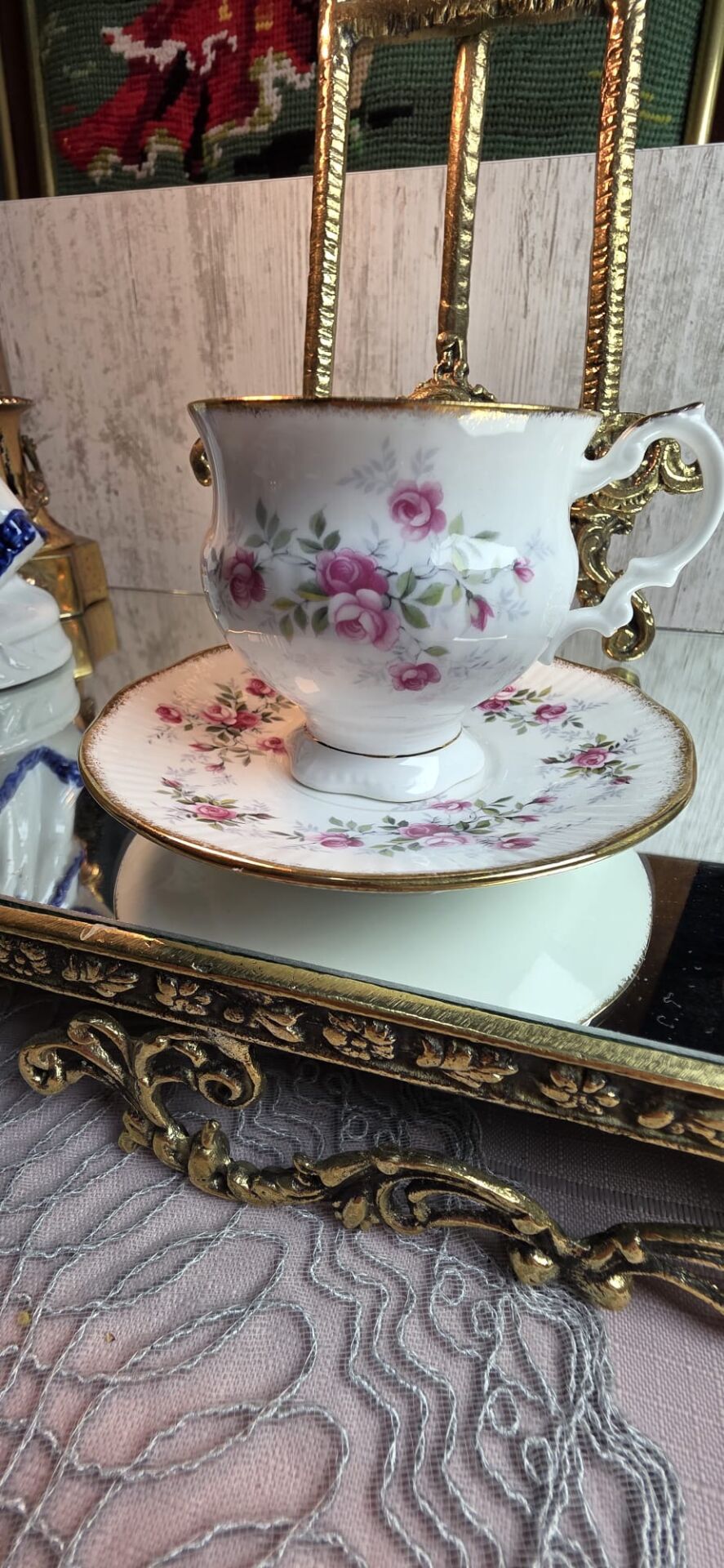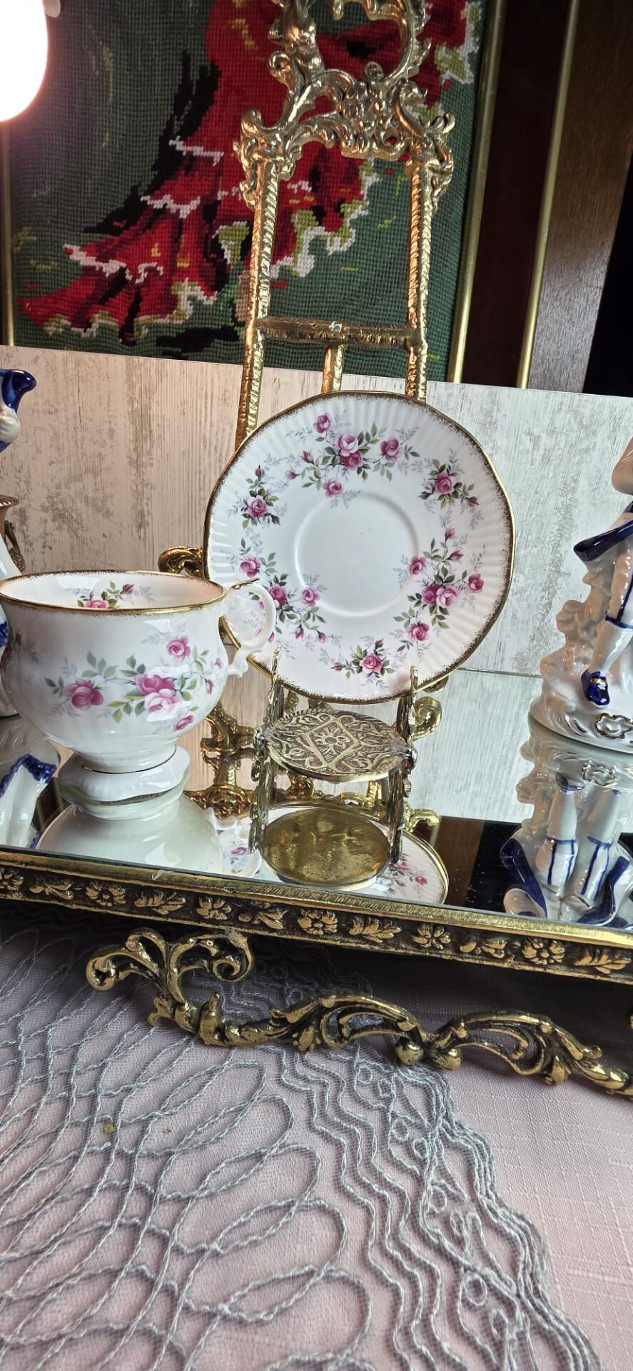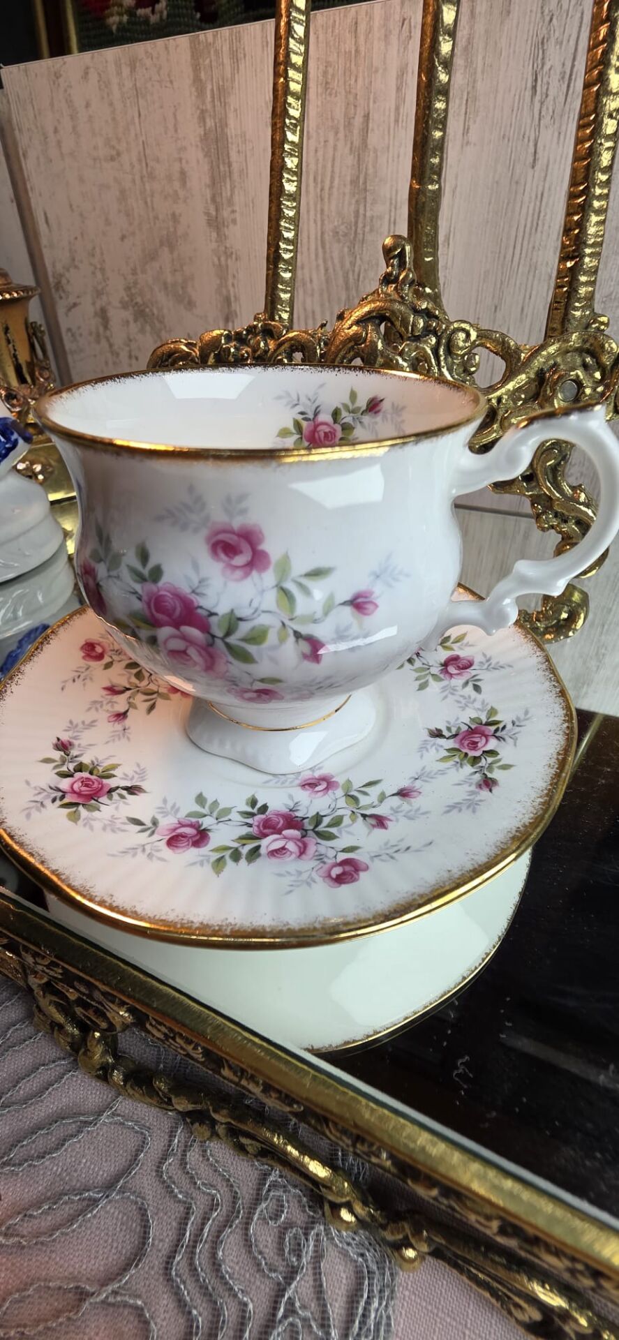 Desen: Fincan ve tabağın üzerindeki desen, pembe ve koyu pembe tonlarında zarif güller ve yeşil yapraklardan oluşuyor. Kenarları altın yaldızla (genellikle Gilt olarak adlandırılır) süslenmiştir, bu da parçaya klasik ve lüks bir görünüm kazandırır.
