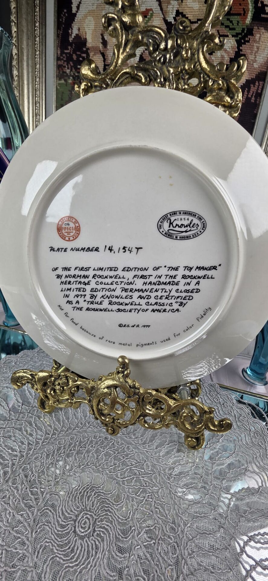 abağın arkasındaki yazıya göre bu, Norman Rockwell'in eserinden yapılmış koleksiyonluk bir tabaktır. Eser Adı: "The Toy Maker" (Oyuncakçı) Koleksiyon: Norman Rockwell Heritage Collection'ın İlk Sınırlı Üretim Serisi'dir. Üretici: Knowles firması (tam adı Edwin M. Knowles China Company, ABD). Üretim Yılı: 1979 (tabakta belirtilen tarih). Sertifika: The Rockwell Society of America tarafından onaylanmış ve sertifikalandırılmıştır. Tabak Numarası: 14.154T (Bu, tabağın sınırlı üretim serisindeki bireysel numarasıdır). Tabağın arkasındaki not, rengin solmamasının nadir metal pigmentleri kullanılmasından kaynaklandığını belirtir. 23.5 cm çapındadır