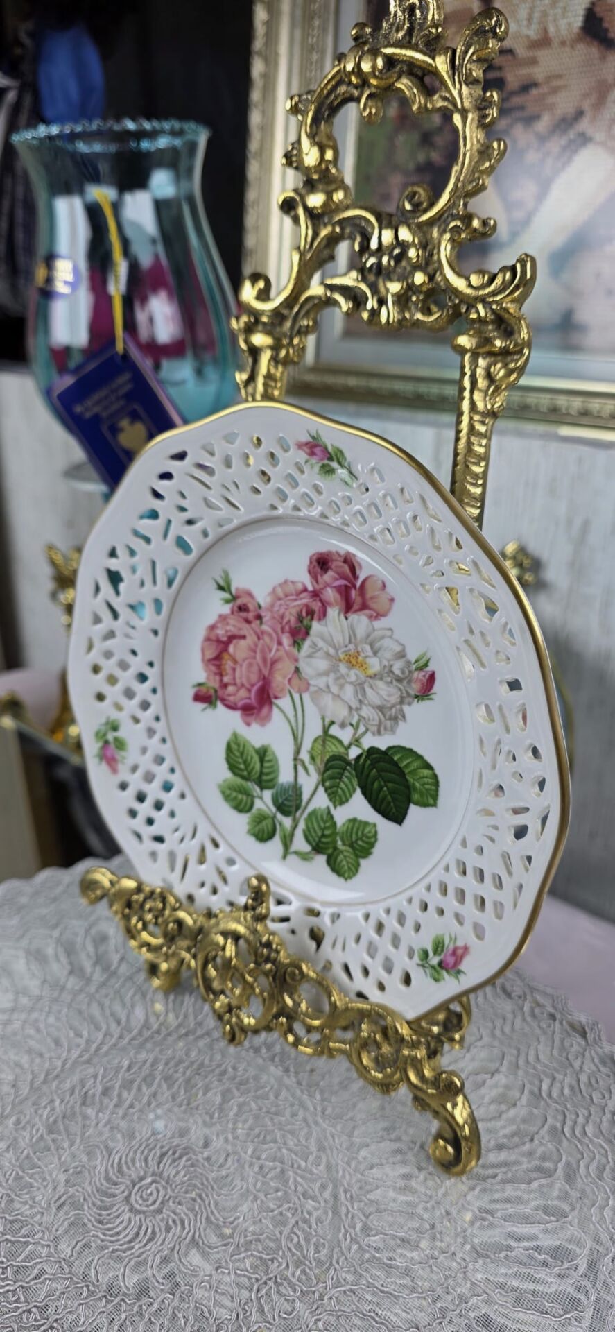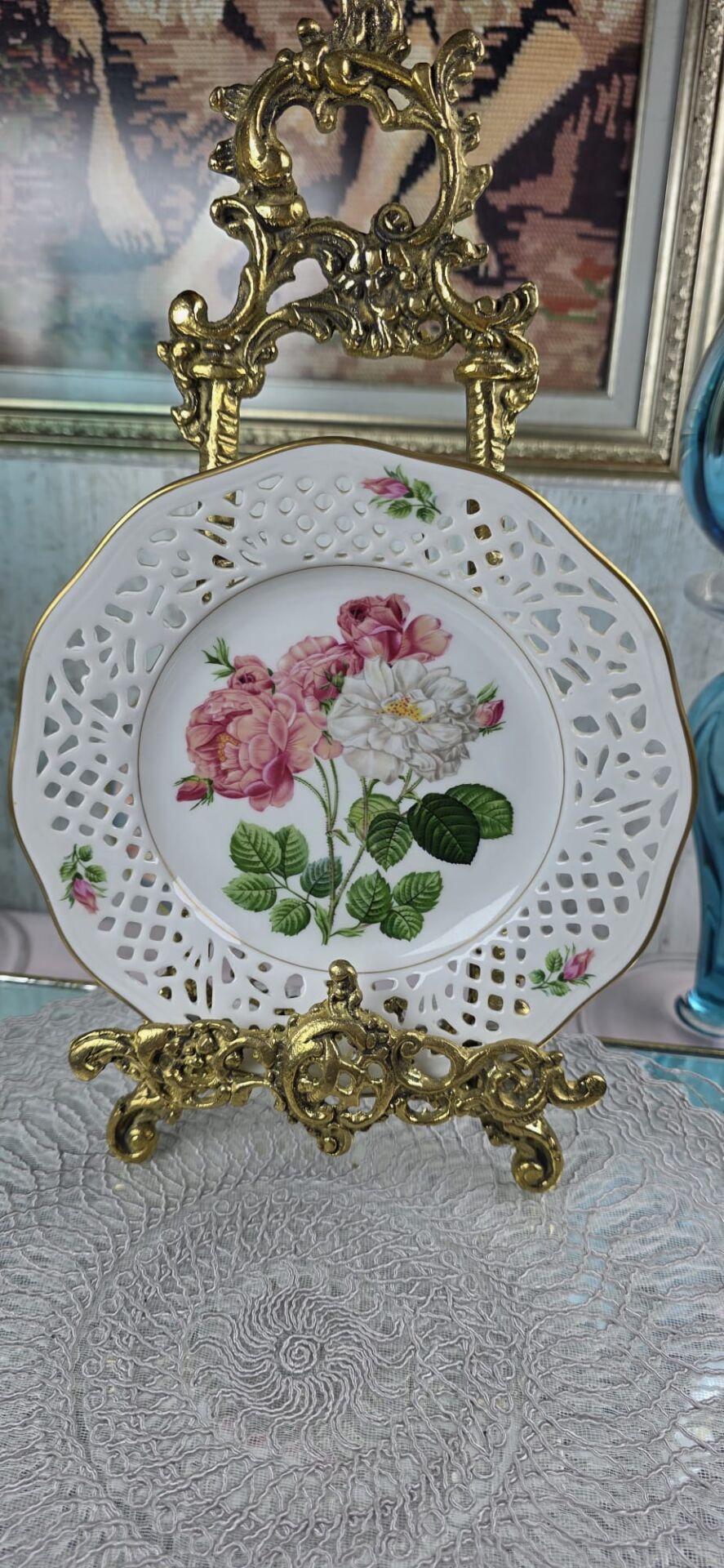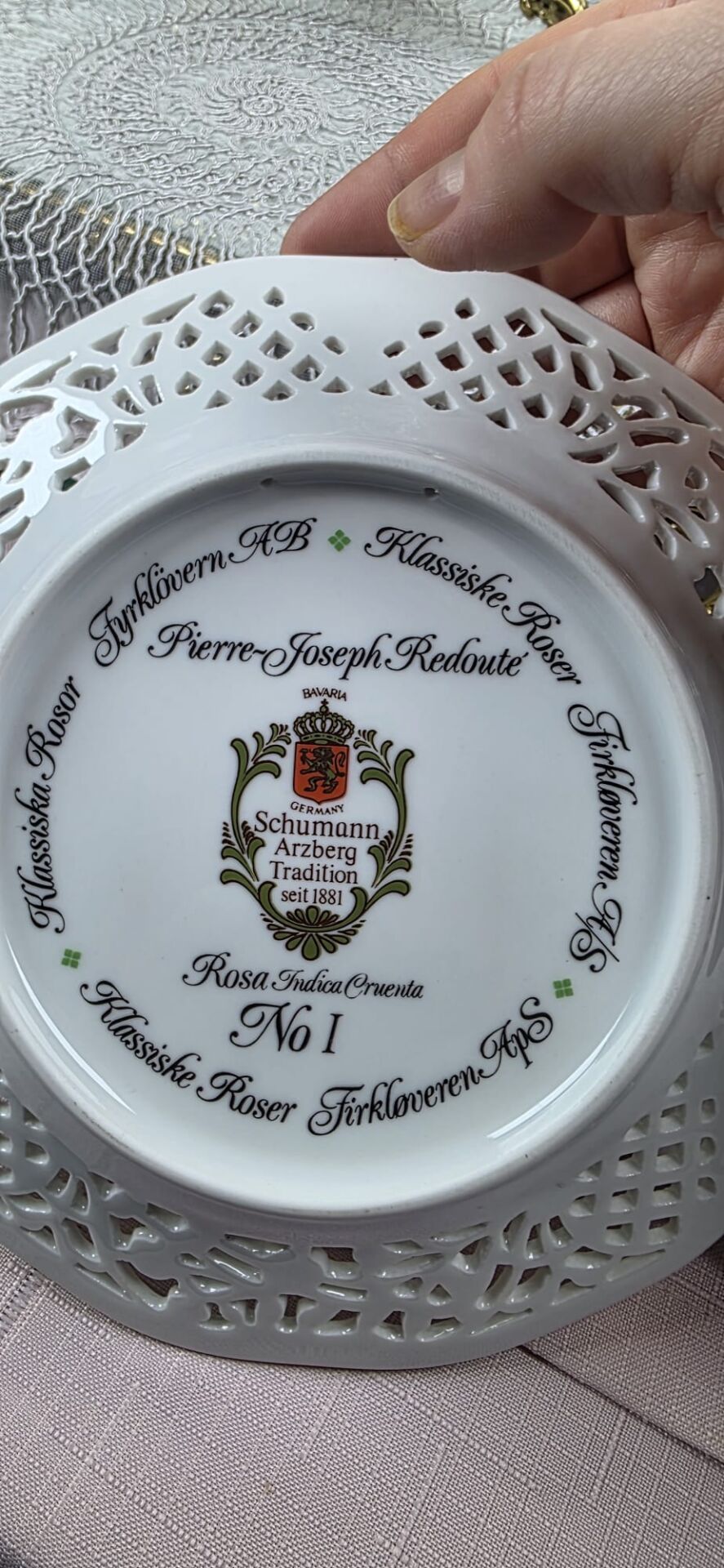 Bu tabak, koleksiyonunuzdaki Alman porseleni güller serisinin ikinci tabağıdır. Kenarındaki zarif ajur (delikli) işçiliği dikkat çekmektedir. Temel Bilgiler Üretici: Schumann Arzberg (Germany / Bavaria). (1881'den beri Gelenek) Sanatçı/İlham Kaynağı: Pierre-Joseph Redouté (Ünlü Fransız botanik sanatçısı). Koleksiyon Adı: "Klassiske Roser" (Klasik Güller) ve "Firkloveren AB" (İskandinav dağıtıcı). Eser/Gül Türü Adı: "Rosa Damascena Celsiana" (Ön yüzde bu gül türünün resmi bulunmaktadır). Seri Sırası: No II (Serinin ikinci tabağı). Önceki Tabak: Serinin ilki ("No I") "Rosa Indica Cruenta" idi. 21 cm